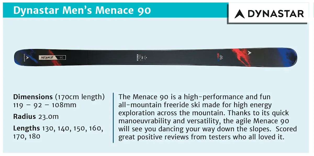 The Dynastar Menace 90 ski is made for high-energy exploration across the front and backside of your favourite resort. At 90mm wide, it's versatile and manoeuvrable in all conditions. Its durable cap construction and poplar wood core combine for high-performance fun.