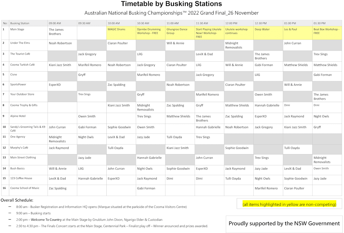 The national final festival commences at 9.00am on Saturday morning with artists performing around town, the final judging to be held at 2.30pm on stage in Cooma’s Centennial Park.