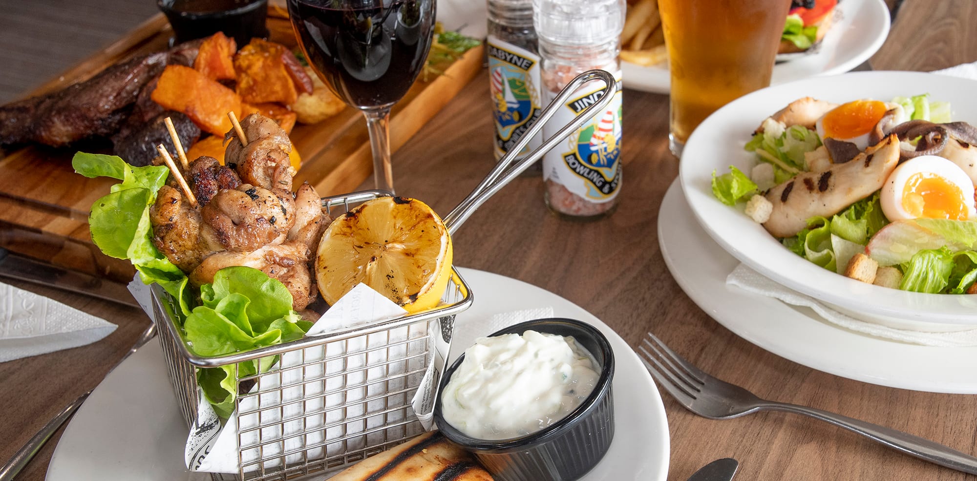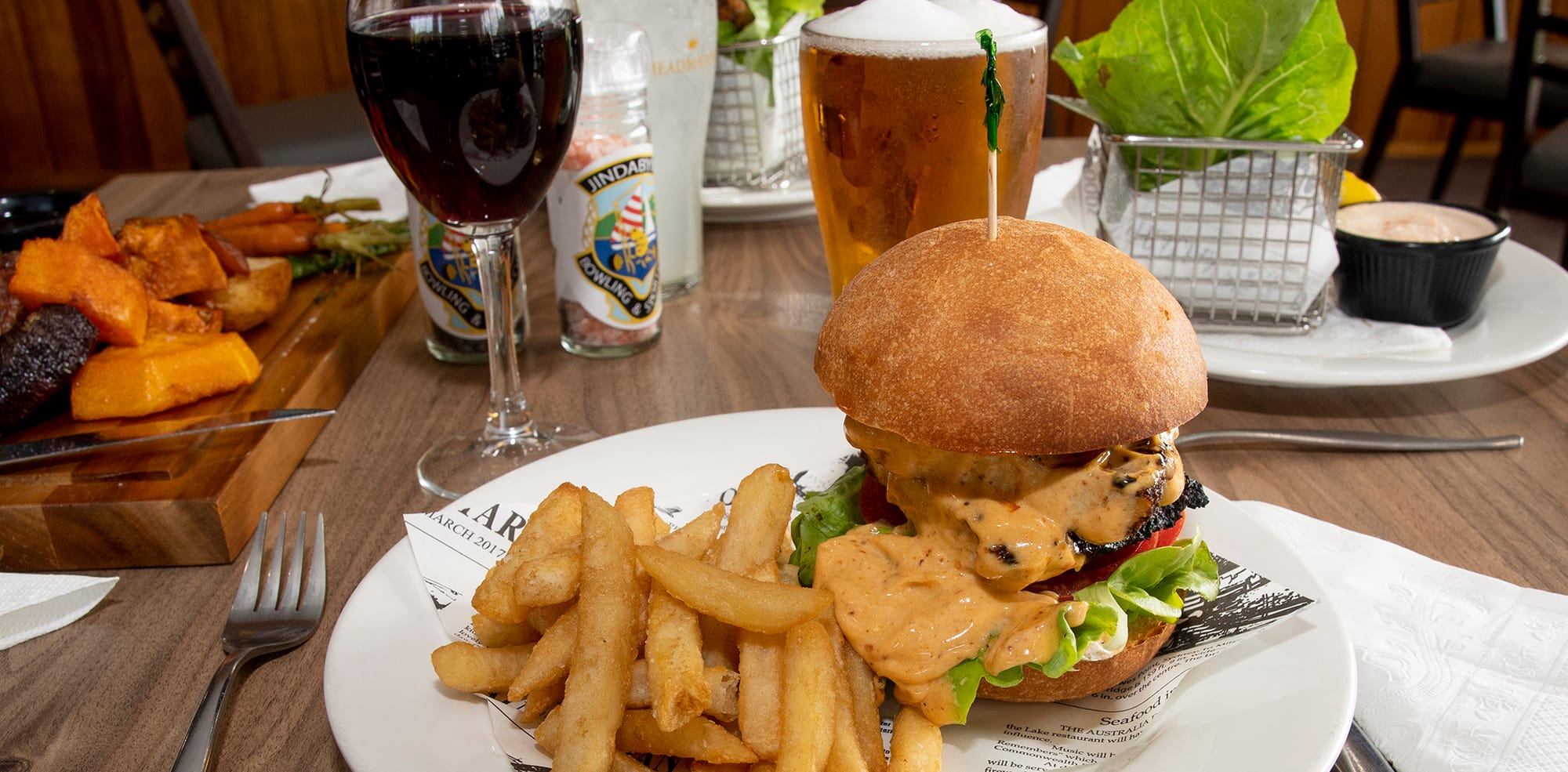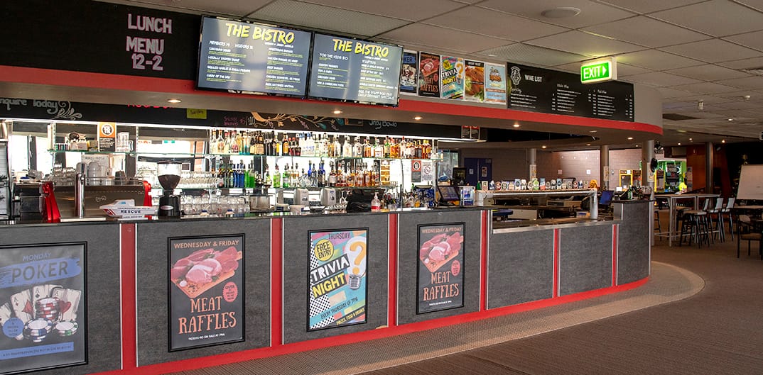 Try the Szechuan squid for lunch or a steak burger. The house curry is superb for dinner, the porterhouse steak is popular, Sunday night is roast night, great kids’ options and members’ discount.