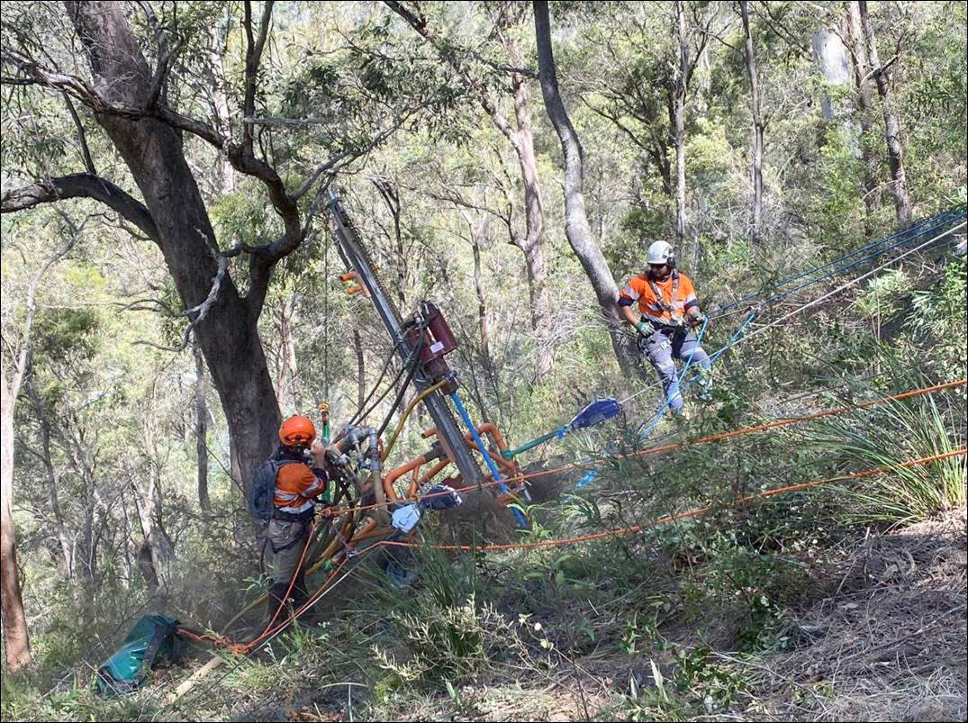 - With the safe working platform above the slip site established, Rutledge Drilling will use rope access to manually scale and remove debris from the crest initially, and then continue to work down slope, progressively removing rocks and loose material whilst continuously placing the drop mesh over the exposed slope.