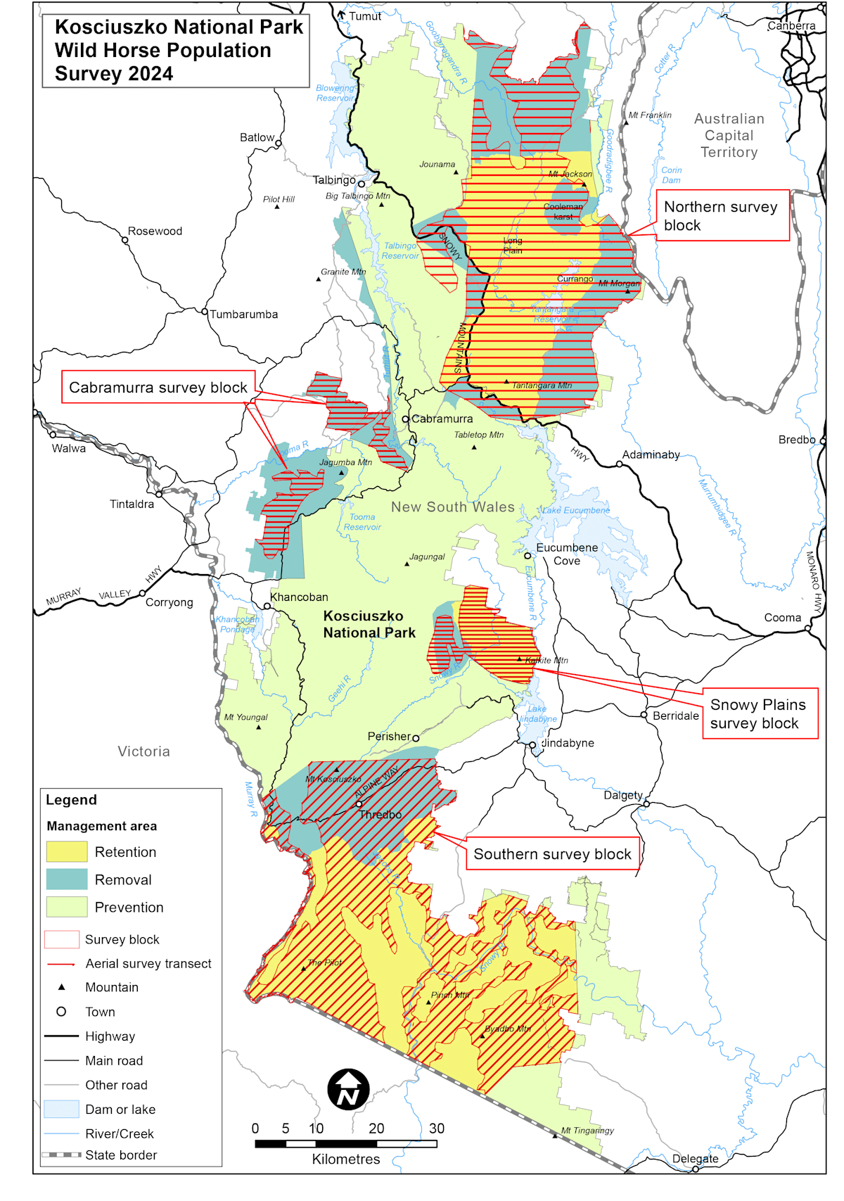 The same areas were surveyed during 2020, 2022, and 2023 in the four priority management areas of the Kosciuszko National Park (KNP) to estimate the 2024 horse populations.