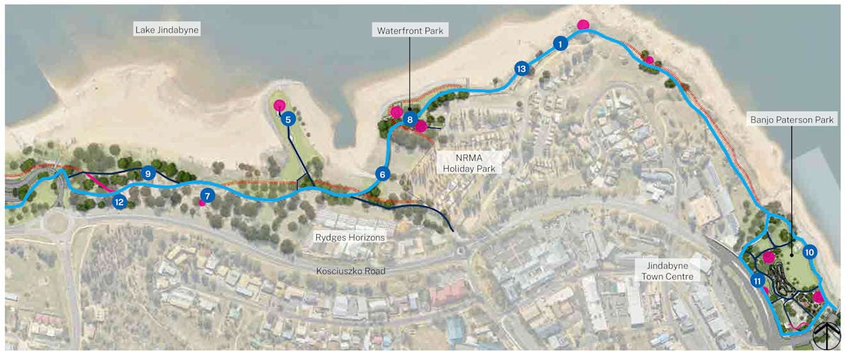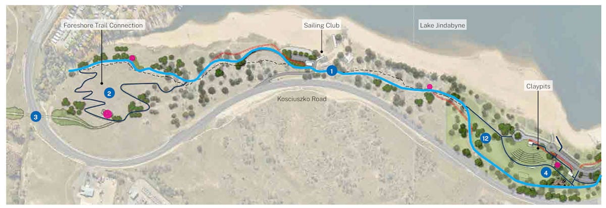 Foreshore Trail Connection, the Lake Jindabyne Sailing Club precinct, the Shared User Path, Claypits, Waterfront Park and Banjo Paterson Park. A new pathway would be three metres wide, extending to four metres in high activity areas and have an elevated section over water near the Waterfront Park.