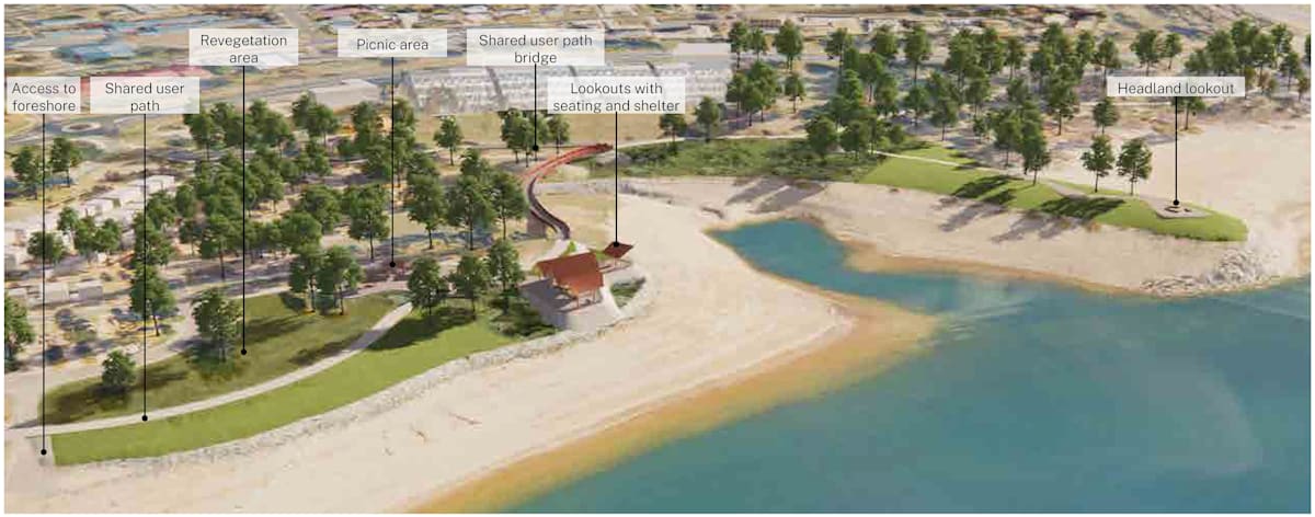 The ‘Foreshore Design’ plans show six key focus areas across the 3.3km kilometre path from Banjo Paterson Park through to the foreshore trail connection near Widows Creek.