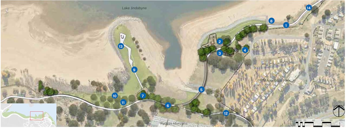 Foreshore Trail Connection, the Lake Jindabyne Sailing Club precinct, the Shared User Path, Claypits, Waterfront Park and Banjo Paterson Park. A new pathway would be three metres wide, extending to four metres in high activity areas and have an elevated section over water near the Waterfront Park.