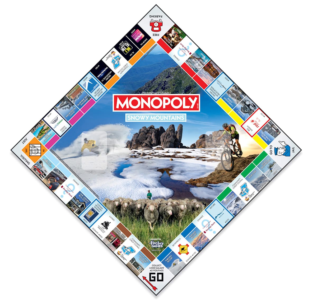 The most expensive properties are Thredbo Resort, which fills the Mayfair position, and Perisher Resort in the Park Lane position. And if you should land in between them, you will donate money to the Ski Patrol.