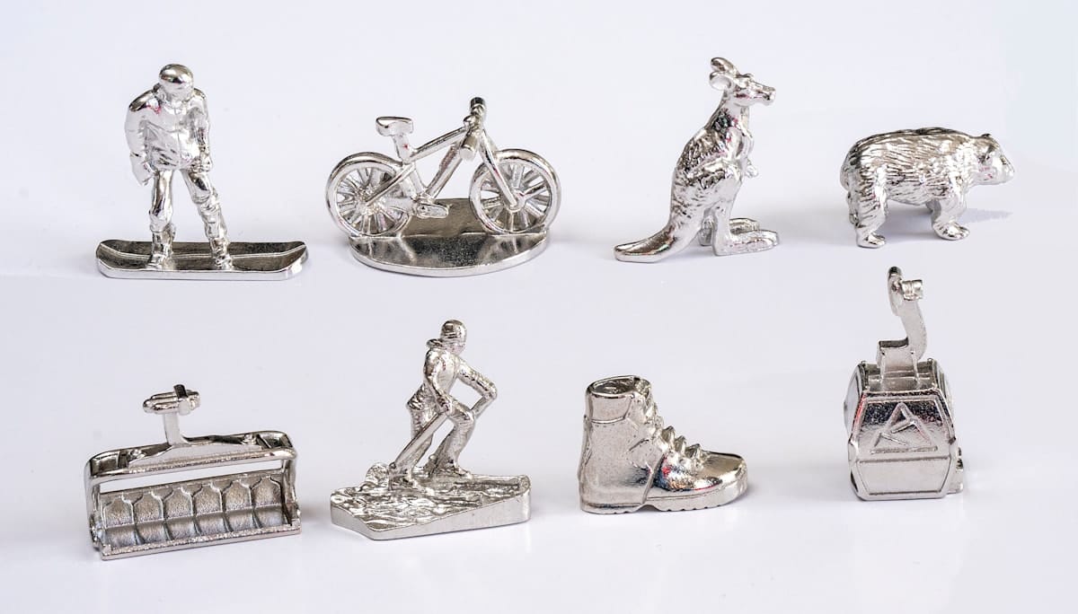 The tokens to move around the board consist of a 6-seat chairlift, a skier, a snowboarder, a gondola, a hiking boot, a mountain bike, and two animals, the wombat and a kangaroo.