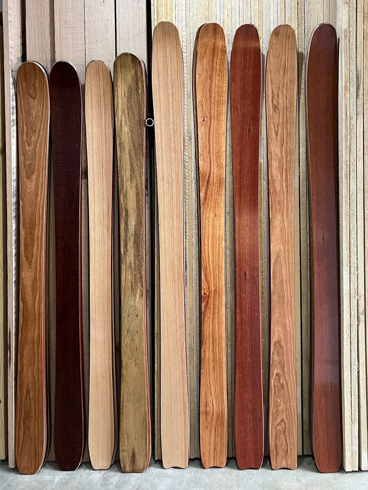 A striking feature of Desert Skis is the Jarrah sidewalls. Growing only in a small region in south-west Western Australia, Jarrah has proven to create sidewalls that are water resistant and durable. Top this off with silver wattle, Victorian ash, and red gum as the various veneers for the top sheets, and you have a beauty of a ski.