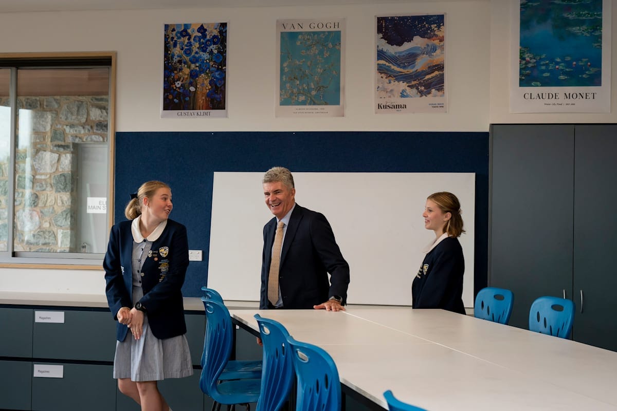Member for Monaro Steve Whan on a guided tour with Sammy Stynes-Garratty and Morgan Tonkin in the arts room.