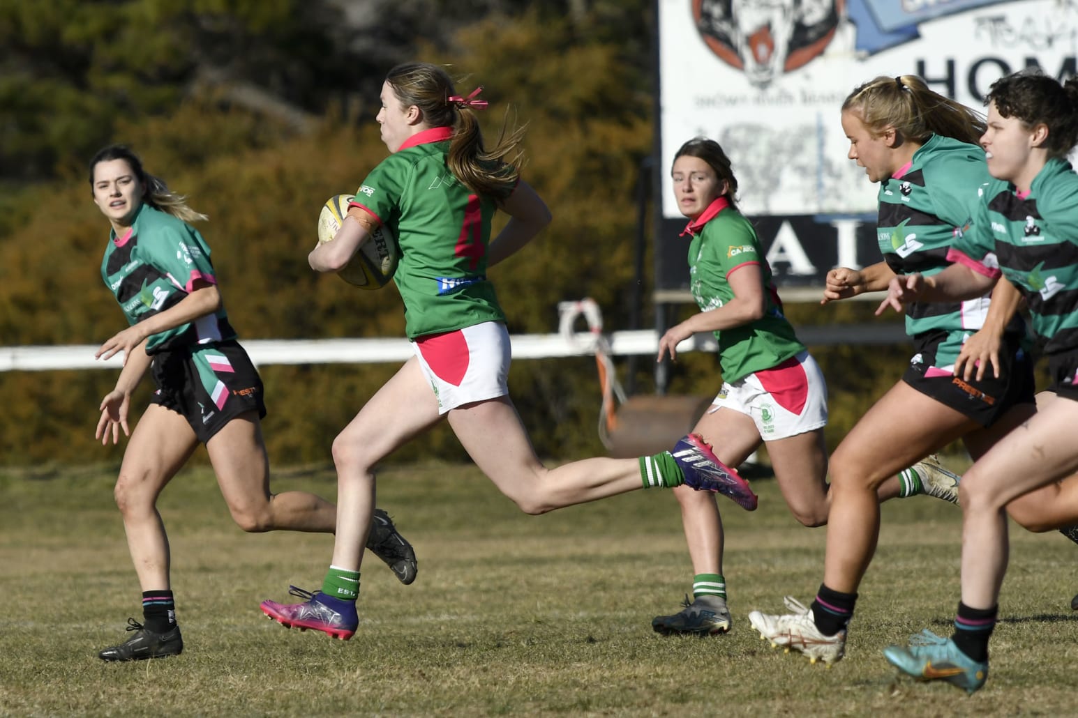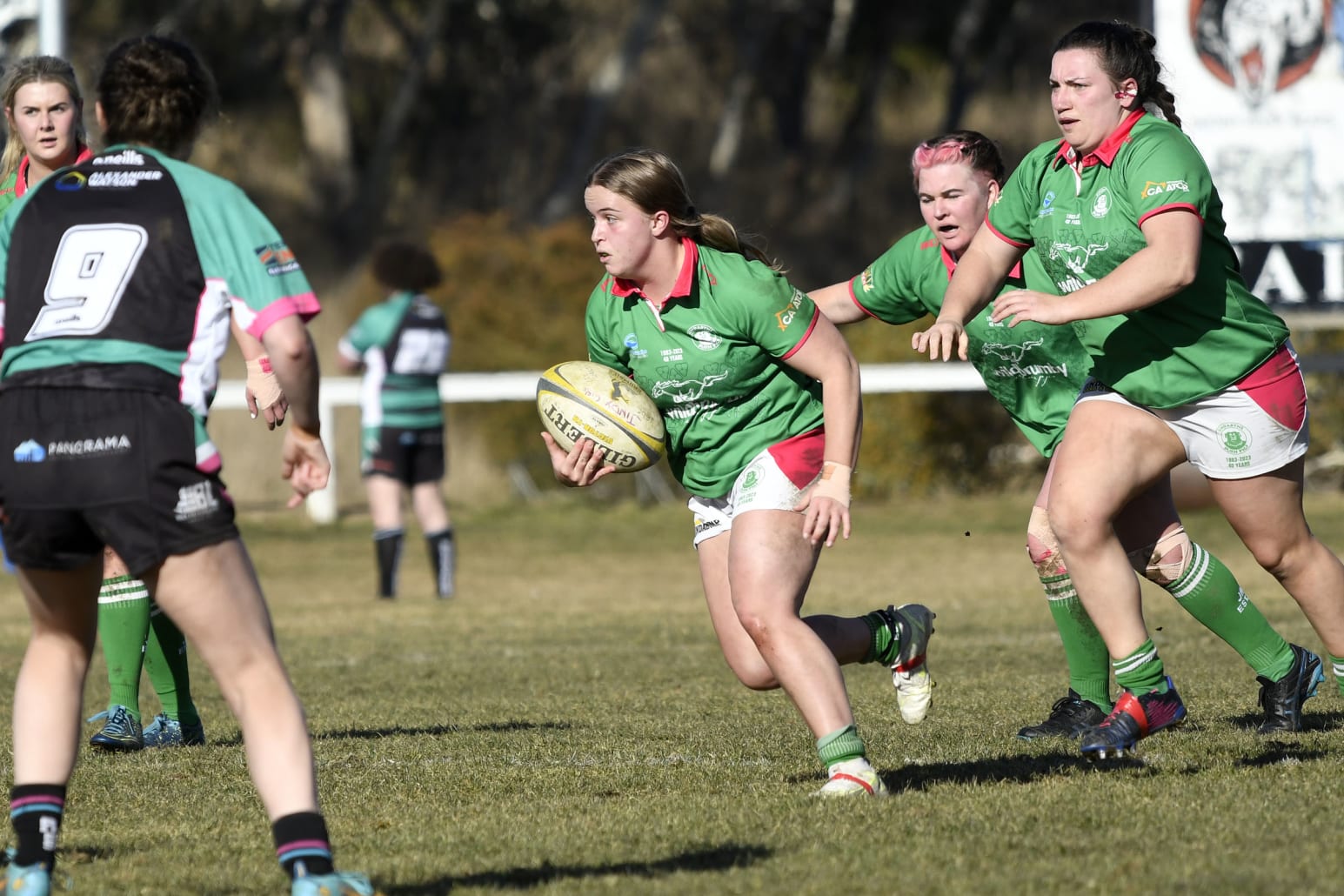 In the Miss Piggies game versus Hall Bushrangers the home girls ran away with a fine victory 34-7.