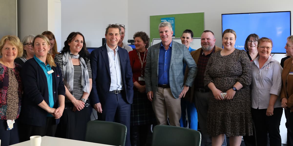 Member for Monaro Steve Whan (right centre) and Minister for Health Ryan Park (left) with health employees in Jindabyne.