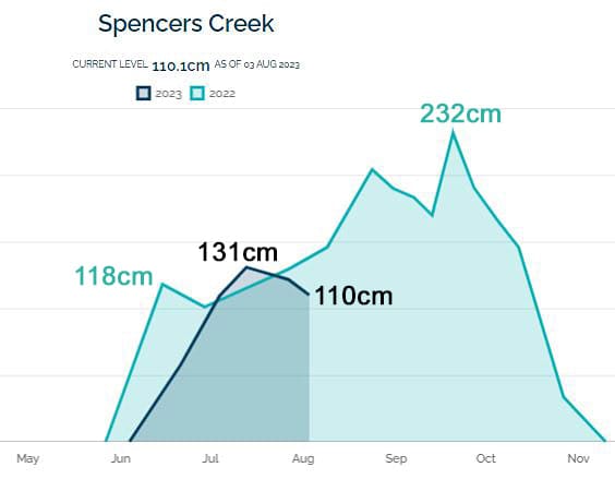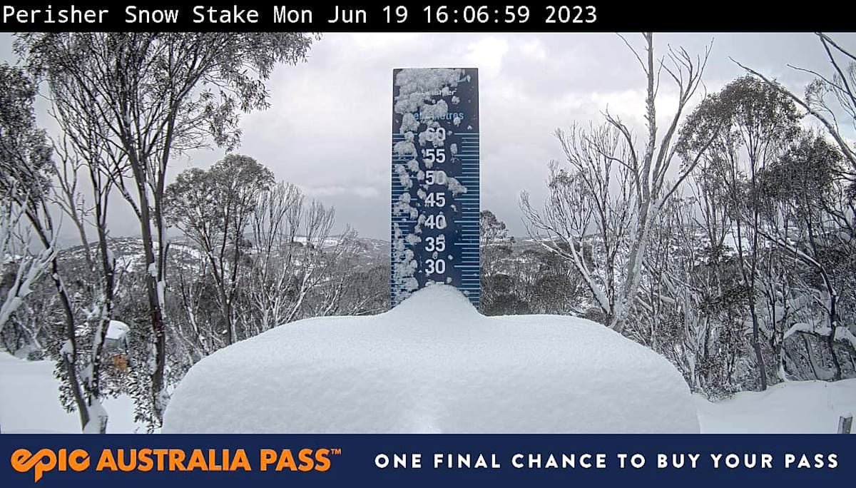 Currently as of early August 2023, the depth is 110cm at Spencers Creek, receding from a high in July of 131cm. If you look at resort web cams you will get an understanding of how this depth relates to different resorts. Plus consider how important snowmaking is for the resorts.