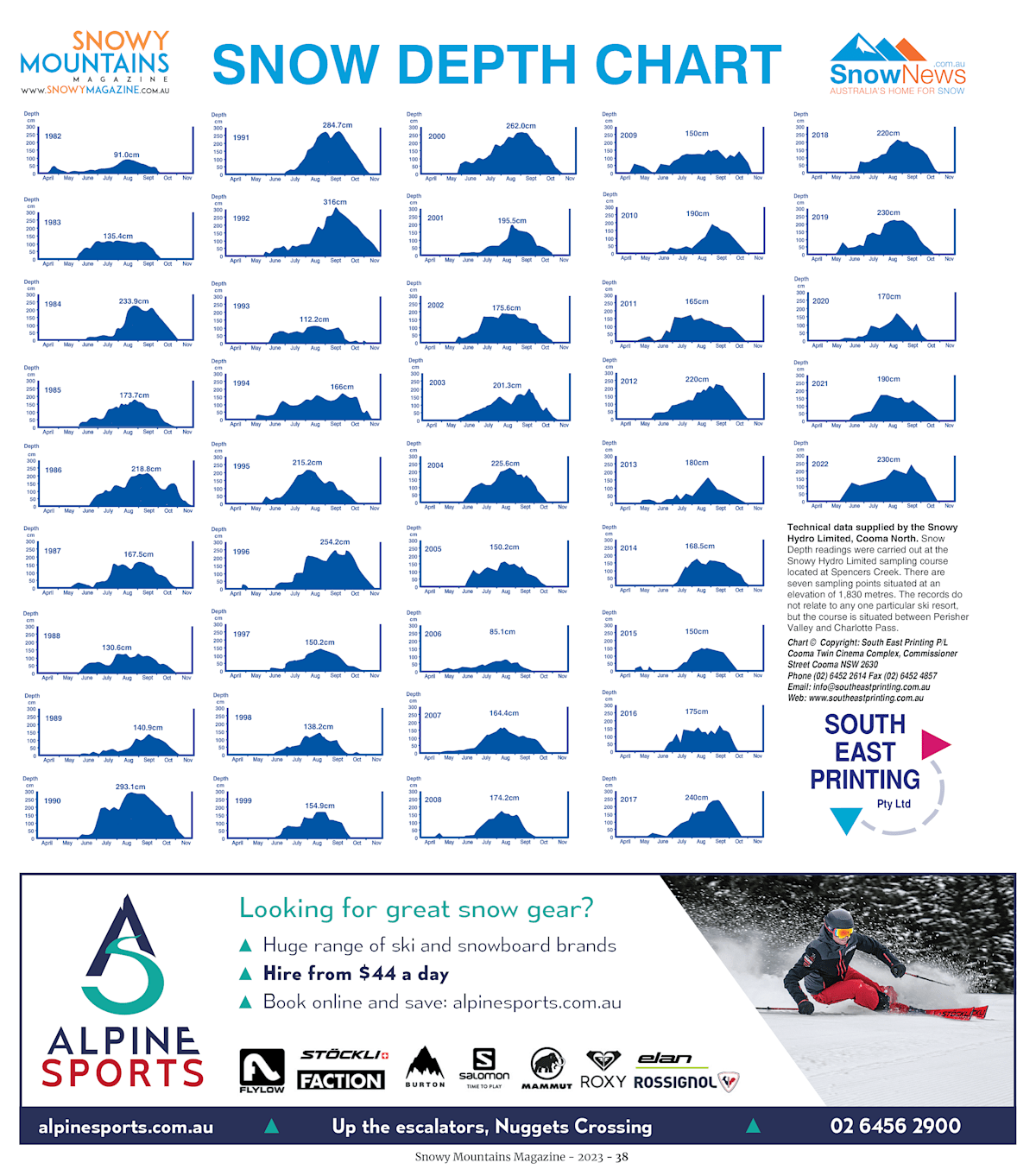 The current Snow Depth Chart in the Snowy Mountains Magazine below.