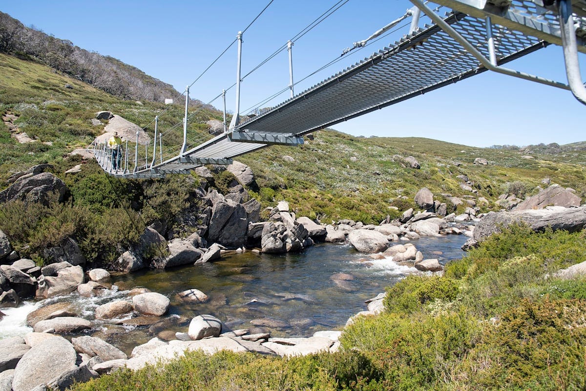 As the Guthega ski slopes appear in the distance you are about to take your first glimpse of the new Spencers Creek bridge, the highest suspension bridge in Australia at 1640 metres elevation.