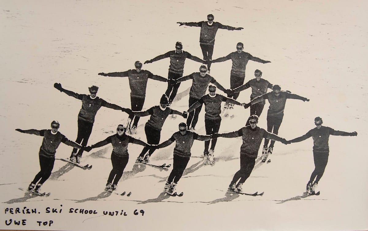 The group in the synchronised skiing photo are front row (l to r) Franz Pichler, Christine Smith, Adam Zapenski, unkonw, Sigi Draxl. Second row, Billy Dittmar, Johnny Destefanis, unknown, Andre Papp. Third row, Jimmy Machado, unknown, Peter Ruschp. Fourth row, unknown, unknown and last row Uwe Boehm.