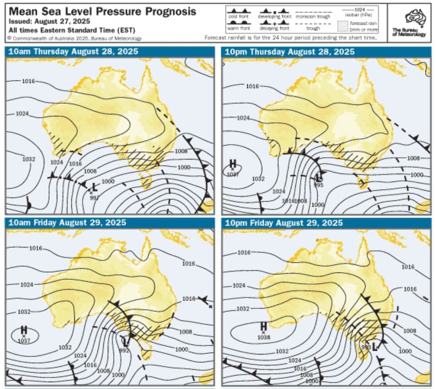 An intense, strong cold front is currently passing across the Snowy Mountains that will deliver bucket loads of snow. It is accompanied by damaging winds.