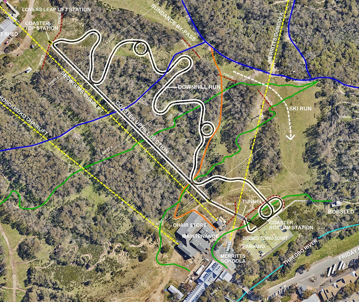 When approved, this rollercoaster-like toboggan amusement attraction will wind 1,040m through alpine and subalpine vegetation zones, from the top of Lovers Leap to the Valley Terminal precinct. Running adjacent to the existing Snowgums chair for the uplink, the top station and start of the ride would commence just below the current first Snowgums unload.