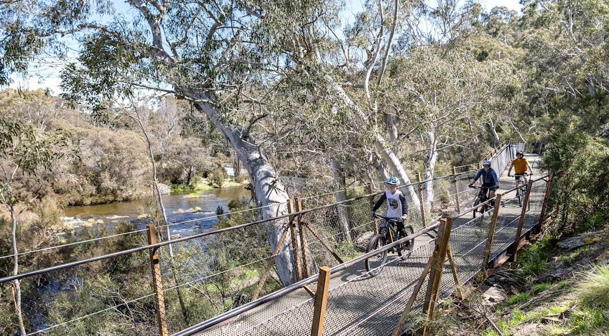 The series of five suspension bridges spanning the Thredbo River on the 9.3km section to Nagrigo Campground is spectacular. The big steel spans, Ramshead Range above and beautiful scenery along the river make this a very enjoyable ride.