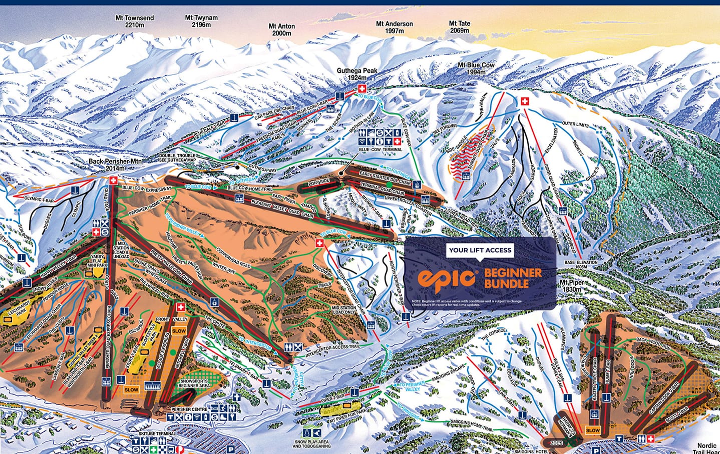 The beginner package allows guests to ski and snowboard on green runs in designated beginner-class areas. At Perisher, this includes the Front Valley area, Pretty Valley, Perisher Quad Express and Happy Valley T-bar. At Smiggin Holes the Pass covers the J-bar area, the conveyor carpets, Hume T-bar and the Kaaten Triple Chair. Visiting Blue Cow, guests can ride the Early Starter Chair, Terminal Quad Chair, the Rope Tow area and the Pleasant Valley Quad.