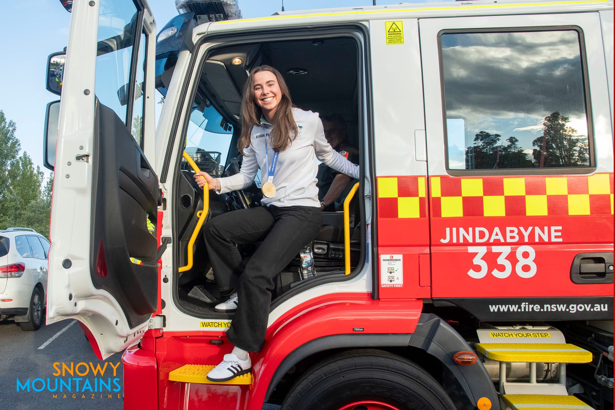 Josie Baff arrives in Jindabyne 328 fire truck before walking along the lake foreshore path where the Lake Light Sculpture festival was underway. PHOTOS: Steve Cuff. Click to enlarge photos.