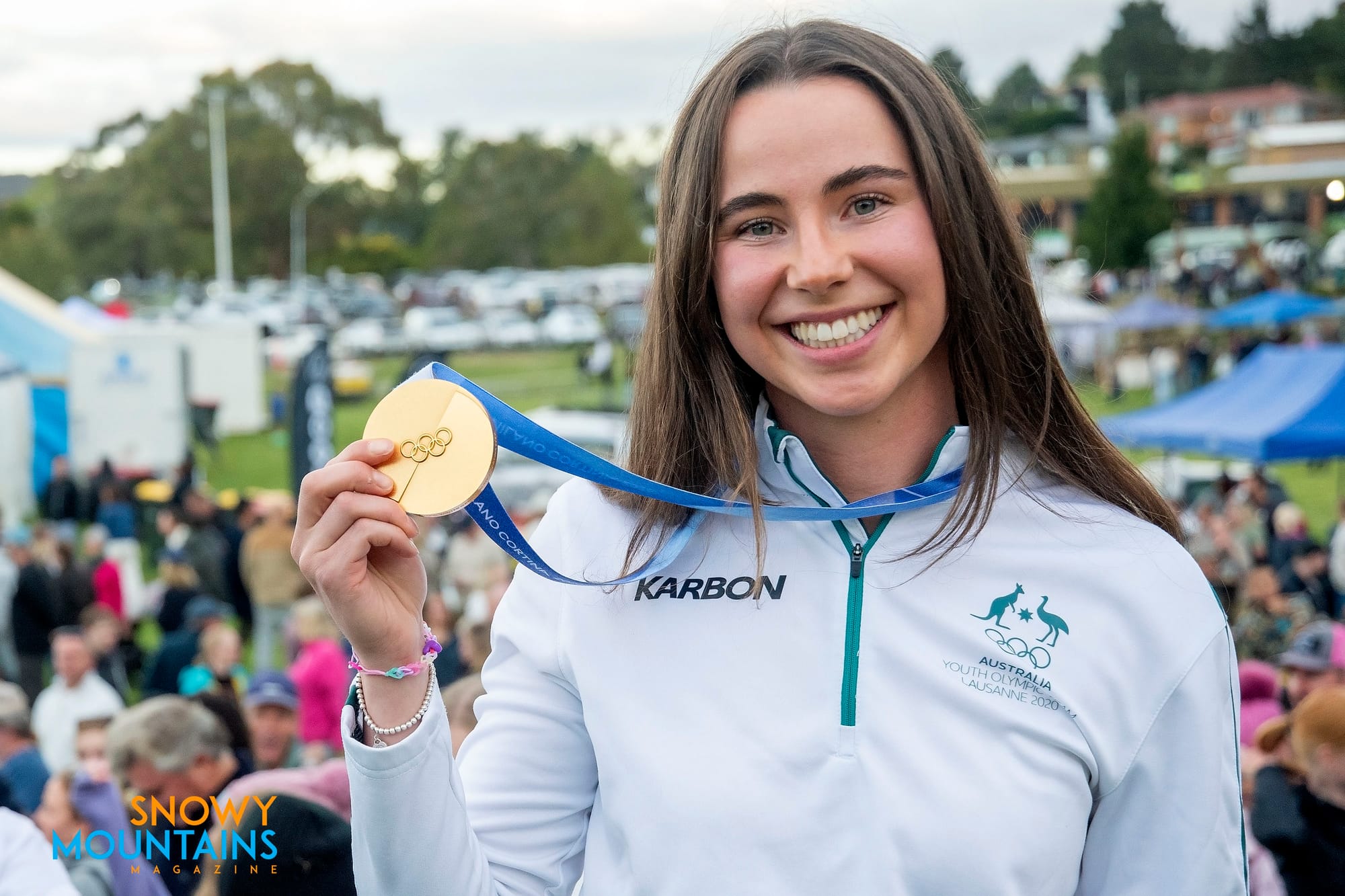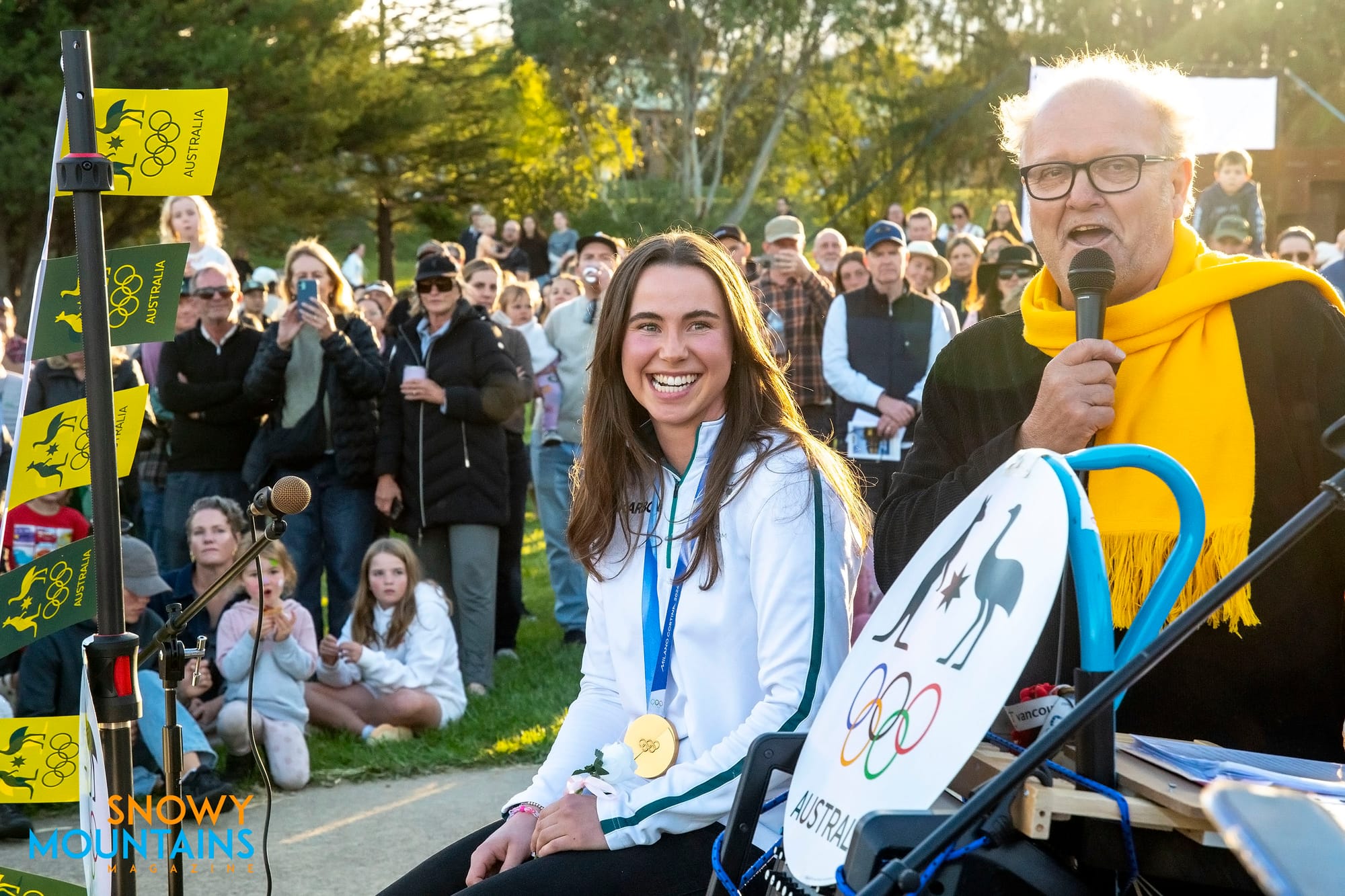 Josie Baff shows off her medal during the Jindabyne welCome home, and in Livigno after her gold medal victory. PHOTOS: Steve Cuff and Chris Hocking / AOC