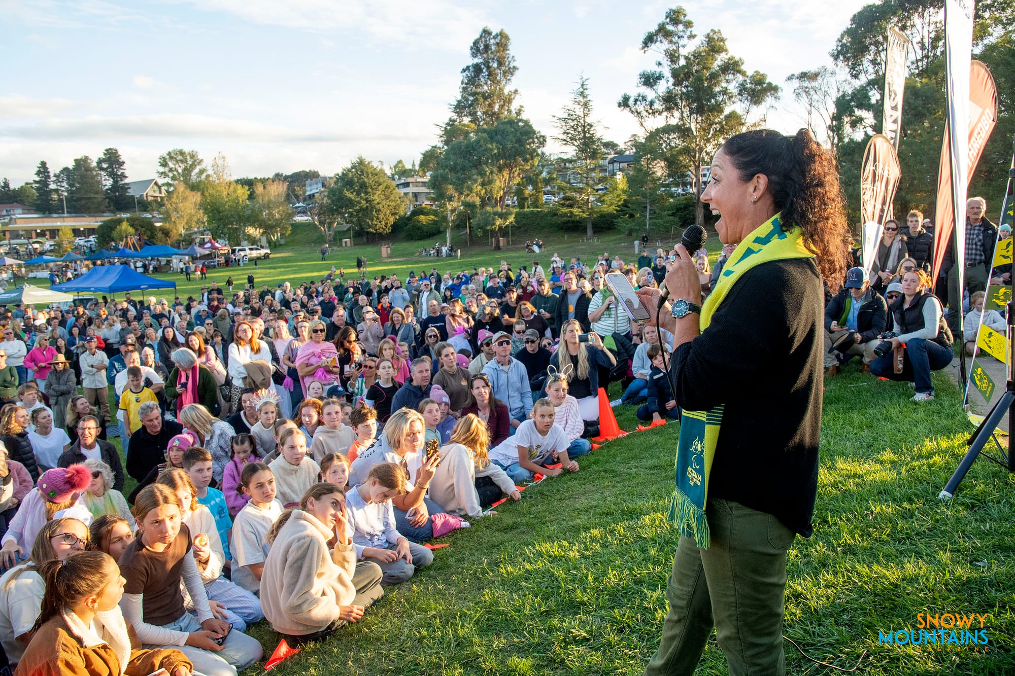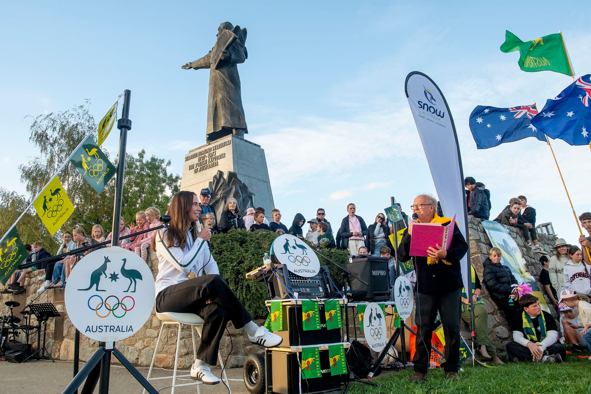 With sirens blazing, Baff arrived in style in the Jindabyne Fire & Rescue 328 truck, then walked along the lake foreshore path to the Strzelecki monument, where the crowd were raucous with applause.